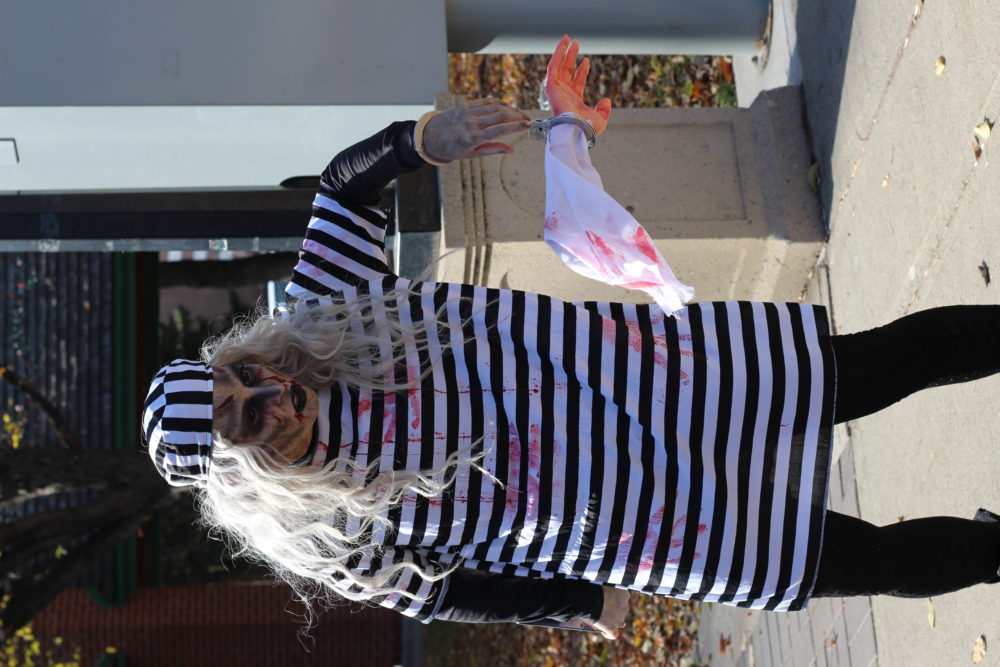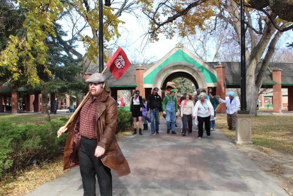 Milo Smith led the zombies from Galt Gardens to City Hall as the walk captain.