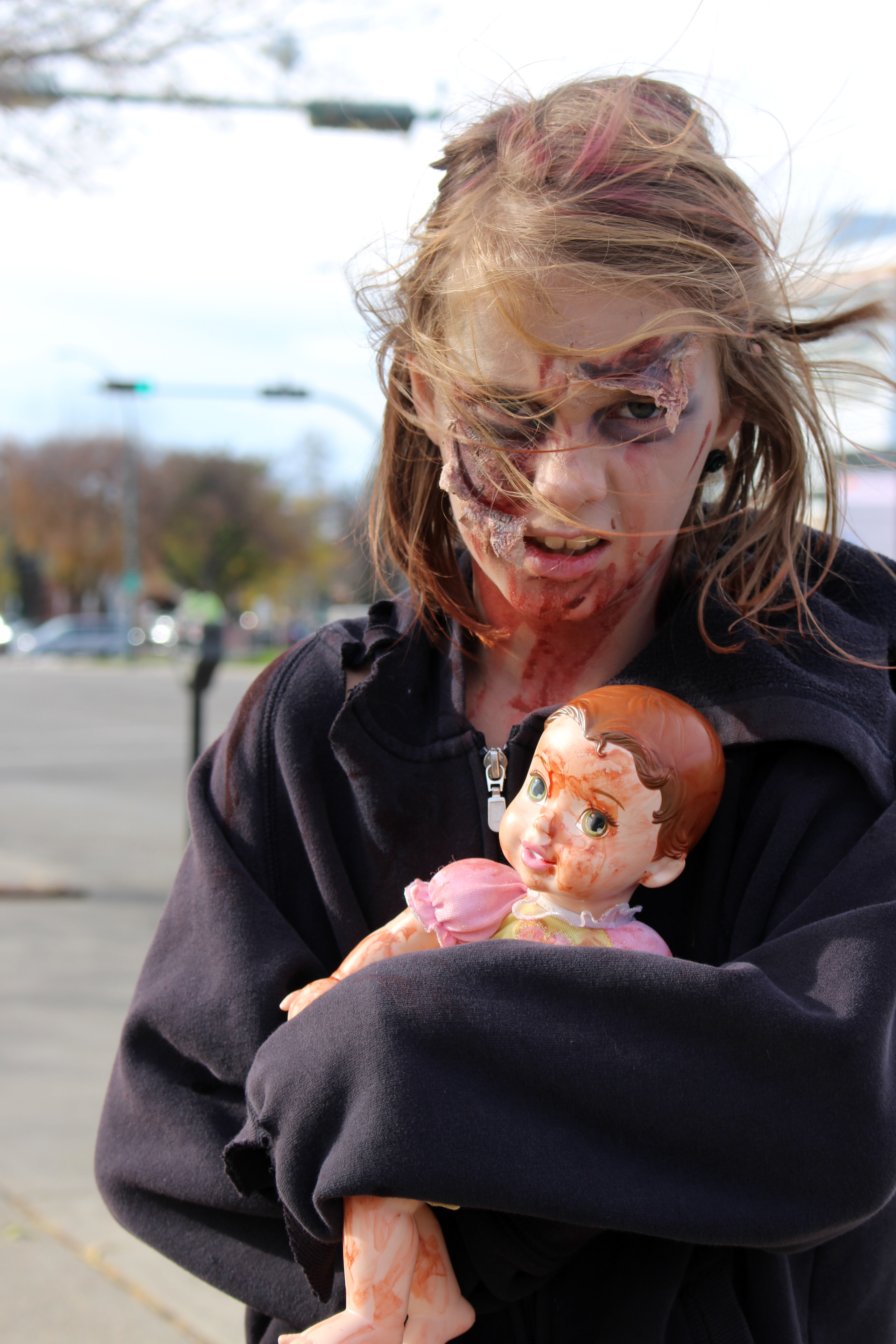 Zombie of all ages took over Galt Gardens Saturday afternoon for the 2017 Zombie Walk. Kaydence Jolley brough her evil doll along to join in the fun.