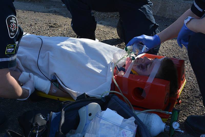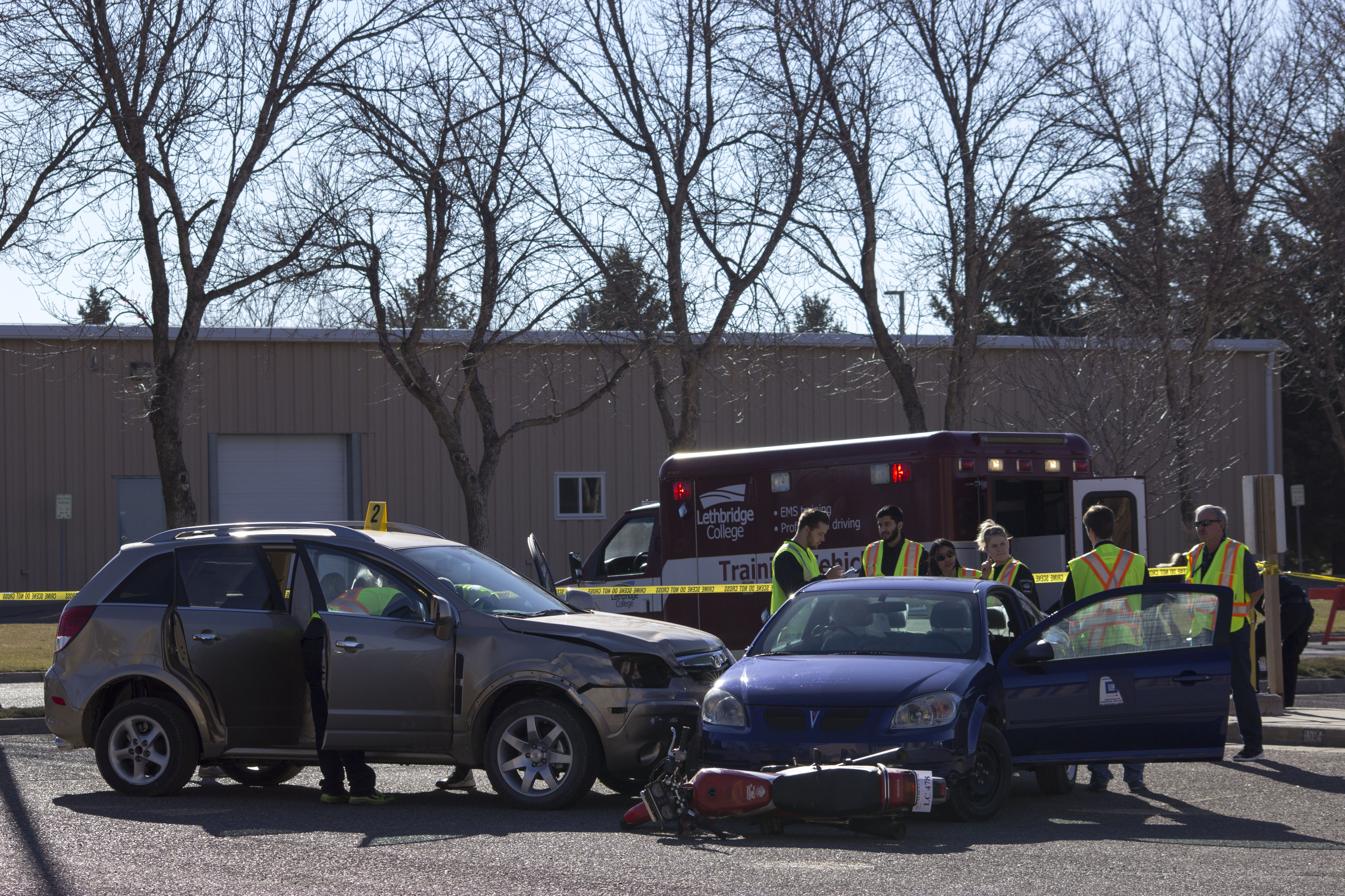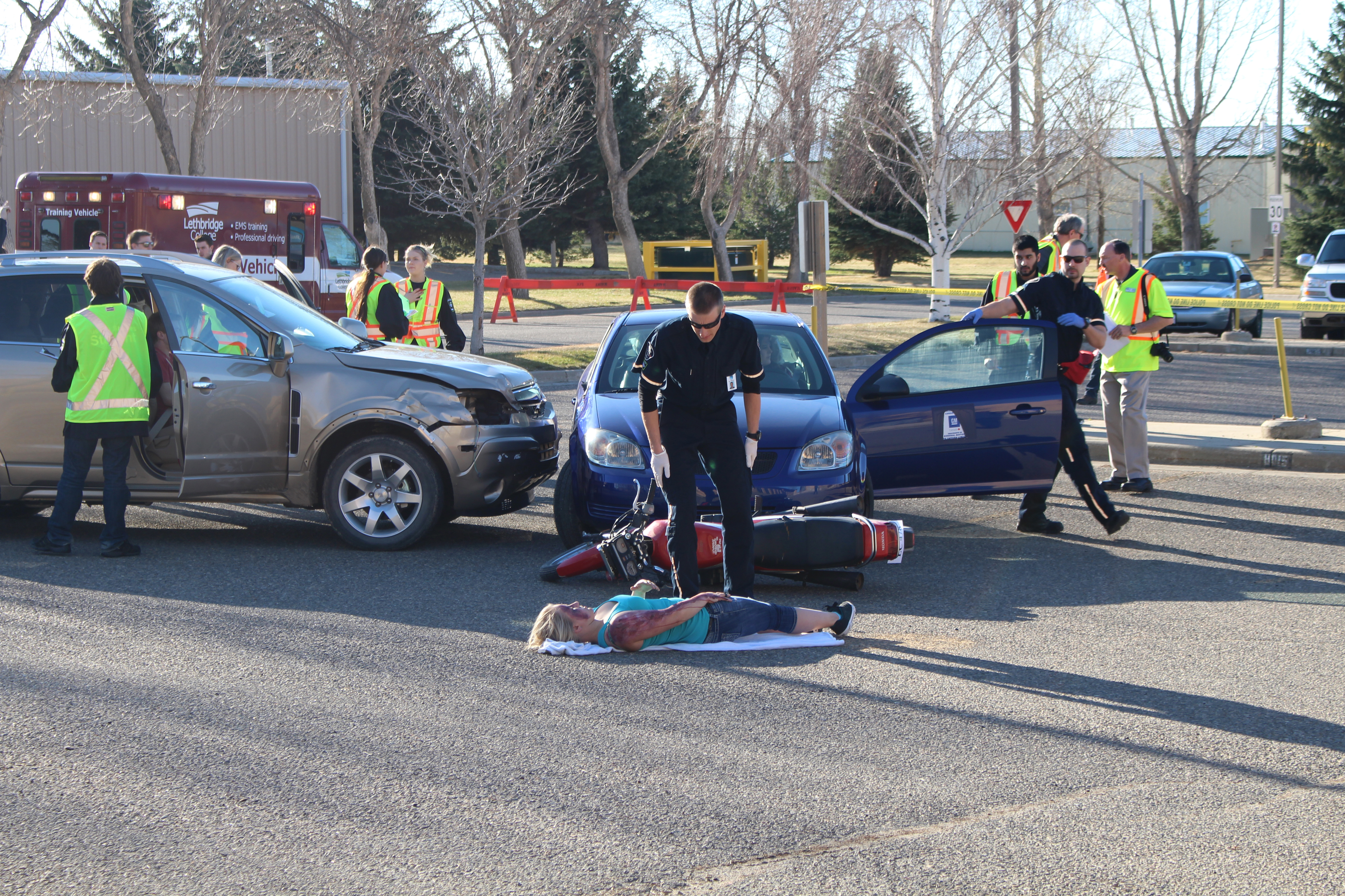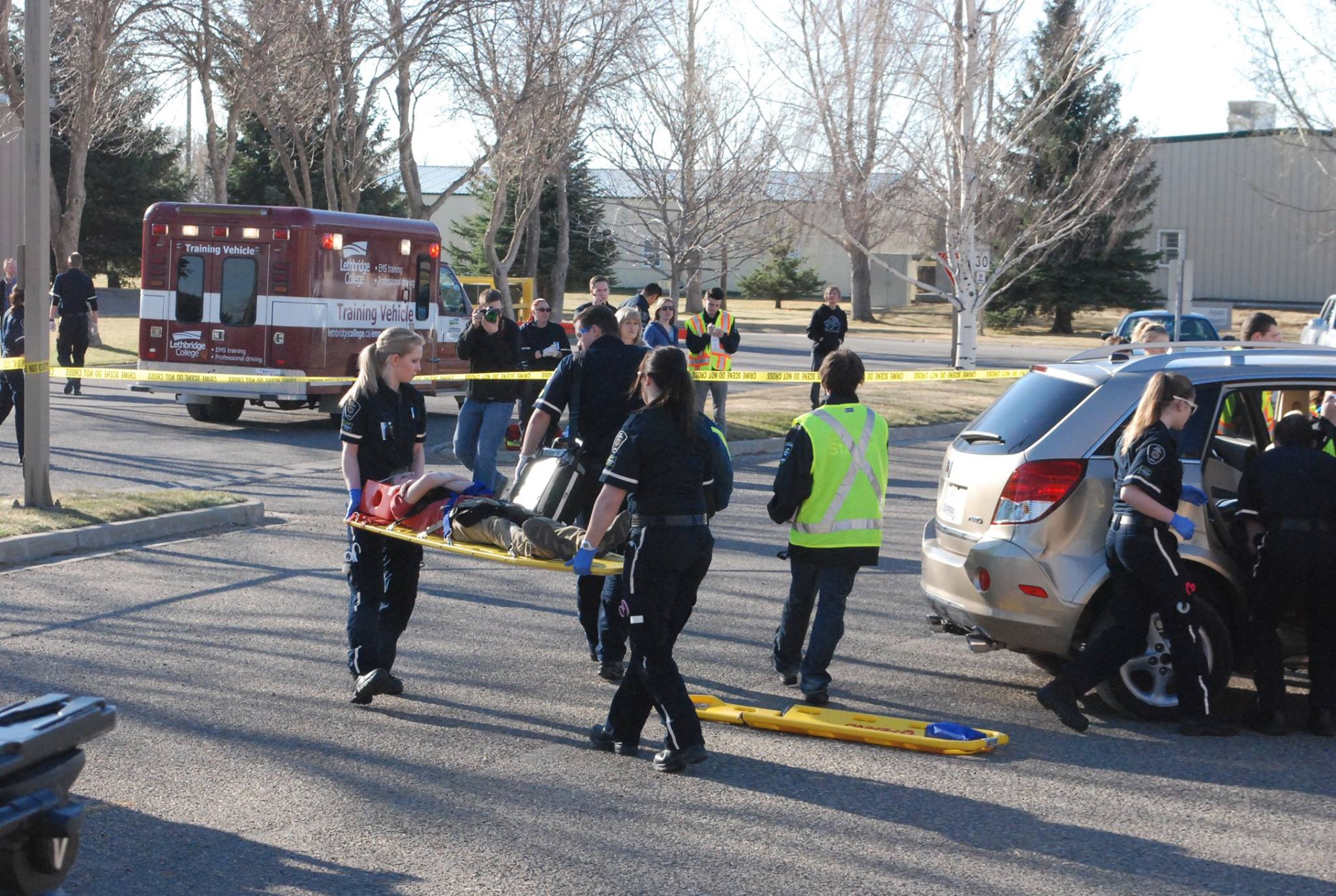 *Scenarios depicted in the following photos were part of a student training exercise at Lethbridge College on Saturday morning. No one was actually injured or involved in the described accident*