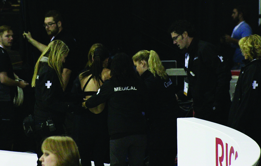 Ladies 2014 Canadian Championships gold medalist and Sochi 2014 team silver medalist Osmond, left the ice seeking medical attention after an awkward landing during rehearsals today at the Enmax Centre. Osmond reappeared on the ice a short time later to cheers and applause from spectators.