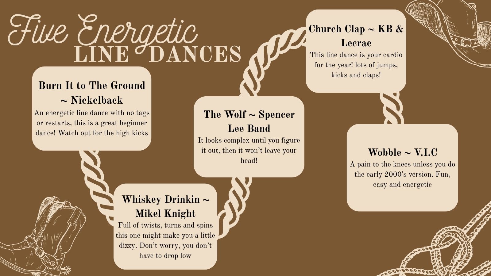 The history of this dance form goes back to the 1800s when immigrants took familiar dances such as polka, square dancing and the waltz and used those ideas to create a synchronized dance form to the newly formed genre of country music. Later on, in the late 1900s songs like “Boot Scootin’ Boogie” by Brooks & Dunn and “Achy Breaky Heart” by Billy Ray Cyrus helped shape the line dancing world and accelerated the way it grew. Some dances are more energetic than others however and according to Sennarey Garven, a first year criminal justice student at Lethbridge Polytechnic, some of these dances give her the chance to shake out the stress and let loose. Her top five for most energetic line dances includes “Burn It to The Ground” by Nickelback, “Whiskey Drinkin” by Mikel Knight, “The Wolf” by Spencer Lee Band, “Church Clap” by Lecrae and “Wobble” by V.I.C.